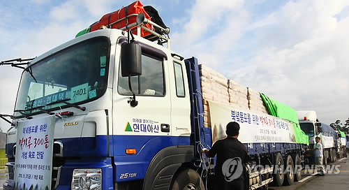 | △ 지난 2010년 8월 경기도 파주시 임진각에서 '민족의 화해와 평화를 위한 종교인 모임'이 준비한 밀가루 300t이 북으로 떠나기 앞서 트럭에 플래카드를 걸고 있다. 2015.5.1 << 연합뉴스 DB >> photo@yna.co.kr |