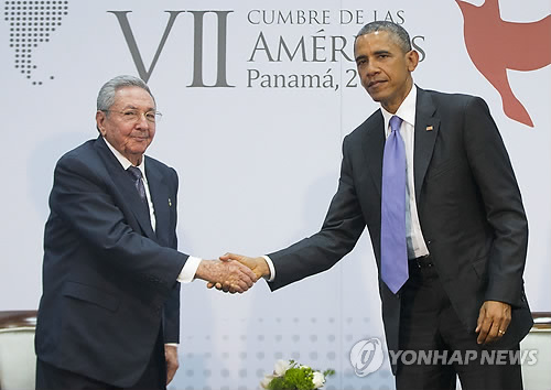| △ 지난 4월 파나마시티에서 열린 미주기구 정상회의에서 만나 악수하는 버락 오바마 미국 대통령(오른쪽)과 라울 카스트로 쿠바 국가평의회 의장. (AP=연합뉴스 자료사진) |