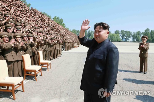 | △ 기념촬영하는 김정은 (평양 조선중앙통신=연합뉴스) 조선중앙통신은 18일 "김정은 동지께서 인민군 제1차 정찰일꾼대회 참가자들과 함께 기념사진을 찍으셨다"고 보도했다. 2015.6.18 photo@yna.co.kr |