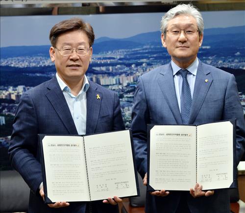 이재명 성남시장과 박기출 월드옥타 회장은 지난달 30일 오후 성남시청 9층 상황실에서 '해외 마케팅 강화와 마이스 산업 활성화에 관한 업무 협약'(MOU)을 체결했다고 월드옥타가 1일 밝혔다.