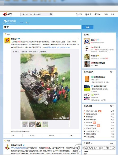 | △ 中 지안서 한국인교육생 탑승버스 추락 (서울=연합뉴스) 중국 연수를 떠난 행정자치부 소속 지방행정연수원 교육생을 태운 버스가 다리에서 추락해 최소 6~7명이 숨지는 등 사상자가 20여 명에 이르는 사고가 발생했다. 1일 오후 5시30분께(현지시간) 중국 지린(吉林)성 지안(集安)에서 한국인 20여명을 태운 버스가 지안과 단둥(丹東) 경계지점 조선족마을 부근 다리에서 하천으로 추락했다. << 웨이보 화면 캡처 >> |