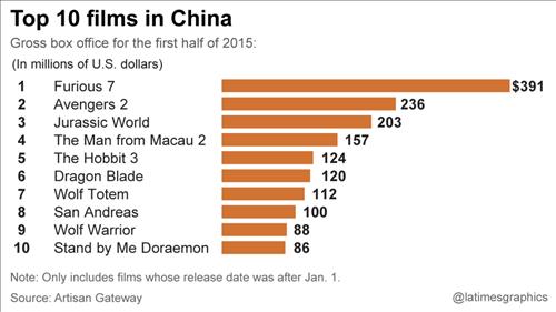 ◇중국의 '티켓파워' 쑥쑥 = 중국 영화시장에서 올 상반기 할리우드 영화의 흥행 대박은 '분노의 질주7'(3억9천100만 달러), '어벤저스2:에이지 오브 울트론'(2억3천600만 달러), '쥬라식 월드'(2억300만 달러) 등이 주도했다.