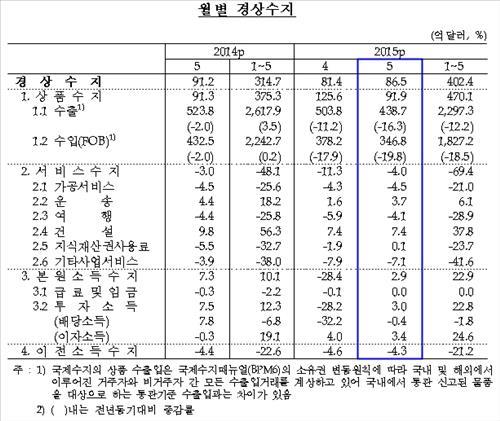 5월 경상흑자 86.5억불…39개월째 사상최장 흑자행진(종합)
