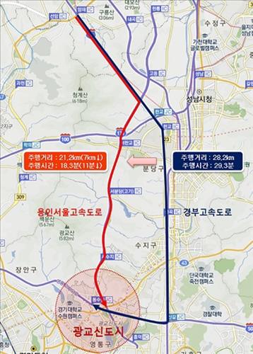 연결로가 만들어지면 양재IC에서 광교신도시까지 기존에 이용하던 경로보다 거리는 7㎞, 시간은 11분 정도 단축돼 18분이면 도착할 수 있다.
