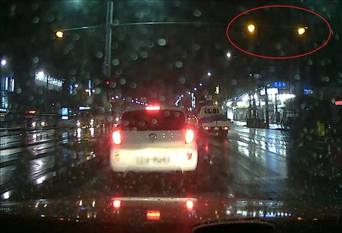 | △ (서울=연합뉴스) 서울 강서경찰서는 교통법규를 위반하는 차량만 골라 고의로 사고를 내 보험금을 가로챈 혐의(상습사기)로 김모(41)씨를 구속했다고 2일 밝혔다. 사진은 김씨(앞차)가 황색신호가 들어오는 순간 속도를 높히다가 급정거를 하며 사고를 유발하기 직전의 모습. 2015.7.2 << 서울 강서경찰서 제공 >> |