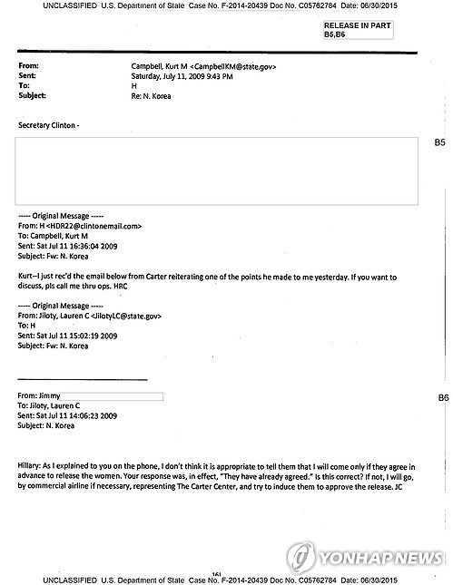 미국 국무부가 지난 1일(현지시간) 공개한 클린턴 전 장관의 이메일에 따르면, 카터 전 대통령은 2009년 7월11일 클린턴 전 장관의 비서에게 이메일을 보내 자신이 두 여기자 석방을 위해 방북하겠다는 뜻을 밝혔다.