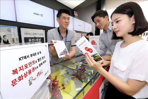 (서울=연합뉴스) 한지훈 기자 = KT[030200]는 국내 이동통신사 가운데 처음으로 회사에서 받은 복지포인트나 문화상품권으로 휴대전화를 구입할 수 있는 길을 열었다고 3일 밝혔다.