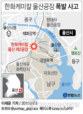 | △ <그래픽> 한화케미칼 울산공장 폭발 사고 (서울=연합뉴스) 이재윤 기자 = 3일 오전 9시 19분께 울산시 남구 여천동 한화케미칼 울산2공장 폐수처리장 저장조에서 폭발 사고가 발생했다. 이 사고로 현장에서 작업하던 협력업체 직원 이모(49)씨 등 4명이 숨지고, 박모(55)씨 등 2명이 실종됐다. 이 공장 경비원 최모(52)씨는 부상했다. yoon2@yna.co.kr 페이스북 tuney.kr/LeYN1 트위터 @yonhap_graphics |