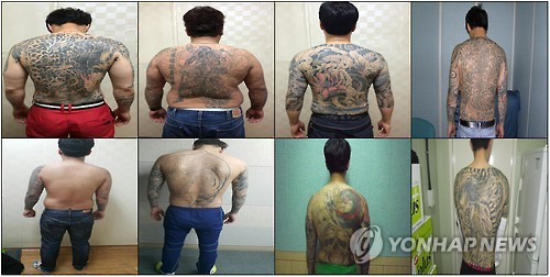 | △ 문신한 '구리식구파' 경기 남양주경찰서는 폭력조직 '구리식구파' 두목과 조직원을 합쳐 70명을 검거했다고 3일 밝혔다. 사진은 조직폭력배가 위력을 과시하려고 몸에 문신한 모습들. 2015.7.3 <<남양주경찰서 제공>> |