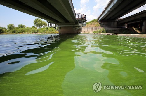 | △ 녹조한강 (서울=연합뉴스) 이정훈 기자 = 한강 하류 전 지점 조류 농도 상승으로 양화대교에서 동작대교까지 조류 경보가 확대 발령된 3일 오후 서울 마포구 성산대교 북단 수중보 인근 한강이 짙은 녹색으로 물들어 있다. |
