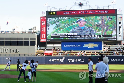 서 씨가 시구를 위해 마운드로 걸어갈 때는 경기장에 걸린 대형 스크린에 남수단에서 촬영한 도 중사의 영상이 뜨기도 했다.
