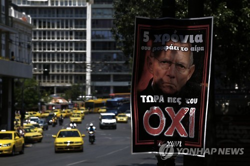 | △ (AP=연합뉴스) 그리스 수도 아테네의 신타그마 광장에 '국민투표에서 채권단의 요구에 반대해야 한다'는 내용의 포스터가 부착돼 있다. |