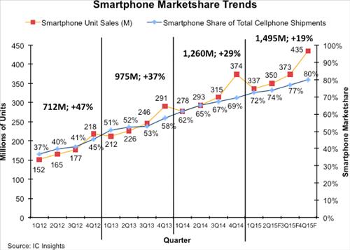 전체 휴대전화에서 스마트폰이 차지하는 비중도 올해 4분기에 처음 80%에 도달할 것이라는 게 IC인사이츠의 예상이다. 올해 1분기엔 스마트폰 비중이 72% 정도다.
