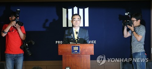 | △ 홍준표·이완구 기소 (서울=연합뉴스) 서명곤 기자 = 성완종 전 경남기업 회장의 정치권 금품제공 의혹을 수사한 검찰 특별수사팀 문무일 팀장(검사장)이 2일 서울 서초구 서초동 서울중앙지검에서 중간수사결과를 발표하고 있다. seephoto@yna.co.kr |