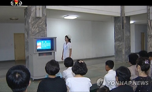 | △ 북한, 메르스 방역 강화 (서울=연합뉴스) 북한이 중동호흡기증후군(메르스)을 막기위해 전국가적인 사업을 진행하고 있다고 조선중앙TV가 24일 전했다. 메르스 관련 교육 받고 있는 북한 주민들 2015.6.24 nkphoto@yna.co.kr |