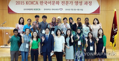| △ 개발도상국 한국어 전공생, 코이카 초청 국내 연수 (서울=연합뉴스) 개발도상국의 한국어 전공 학생 15명이 한국국제협력단(코이카)의 초청으로 6일 경희대학교 국제교육원에서 한국 전문가가 되기 위한 연수를 시작했다. 2015.7.6 << 경희대 국제교육원 제공 >> photo@yna.co.kr |