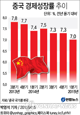 중국의 경제 성장률은 지난해 1분기 7.4%, 2분기 7.5%, 3분기 7.3%, 4분기 7.3% 등으로 연간 7.4%를 기록해 24년 만에 최저치로 떨어졌다. 올해 1분기 성장률은 더 낮아지며 3개월 연속 하락세를 보였다.
