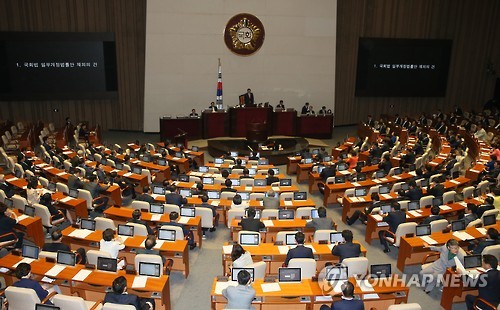 | △ 국회법 개정안 재의안 본회의 상정 (서울=연합뉴스) 진성철 기자 = 6일 국회 본회의에서 국회법 개정안 재의안이 상정되고 있다. |