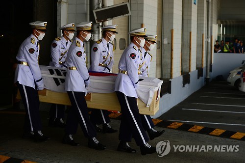 오후 3시께 의장대가 화물고 앞에 도열, 검안을 끝낸 시신이 밖으로 운구될 조짐을 보이자 유족들은 화물고 입구까지 걸어나가 고인을 맞았다.