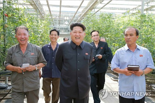 | △ 북한 김정은, 평양 채소과학연구소 시찰 (서울=연합뉴스) 김정은 북한 국방위원회 제1위원장이 평양 채소과학연구소를 현지시찰하고 아득하게 펼쳐진 온실들이 너무 멋있다며 칭찬을 아끼지 않았다고 북한 노동신문이 7일 보도했다. 2015.7.7 nkphoto@yna.co.kr |