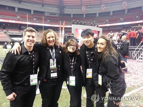 | △ 팬암대회 개폐막식 무대 연출하는 캐나다 한인 1.5세 (서울=연합뉴스) 왕길환 기자 = 오는 10일(현지시간)부터 26일까지 토론토 등 캐나다 온타리오주 일대에서 41개국 49개 종목 7천500명이 참가한 가운데 열리는 팬아메리칸게임(팬암대회)의 개·폐막식 무대 연출을 맡은 캐나다 한인 1.5세 장희용 씨(오른쪽 두 번째). 그는 팬암대회가 끝난 뒤 다음 달 7일부터 9일간 같은 장소에서 열리는 장애인들의 제전인 패러팬암대회도 처음과 끝을 장식하는 무대 연출을 맡았다. (캐나다 한국일보 제공) |