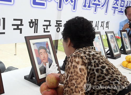 | △ 지난 2013년 국립대전현충원에서 열린 제2연평해전 전사자 11기 추모식에서 고(故) 한상국 중사의 어머니가 아들의 영정 사진을 쓰다듬고 있다. (연합뉴스 자료사진) |