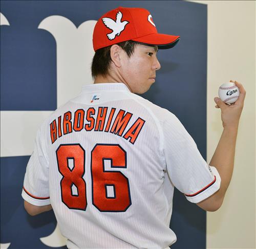 | △ 피폭일인 내달 6일 경기때 입을 유니폼 착용한 히로시마 투수 마에다 겐타(교도=연합뉴스) |