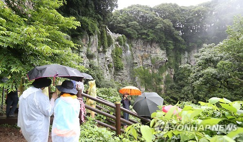 | △ 관광객들로 붐비는 엉또폭포 (서귀포=연합뉴스) 박지호 기자 = 제주 일부지역에 호우경보가 내려진 7일 오후 서귀포시 강정동 엉또폭포가 관광객들로 붐비고 있다. 엉또폭포는 최소 70㎜ 이상의 비가 와야만 떨어지는 물을 볼 수 있다. |