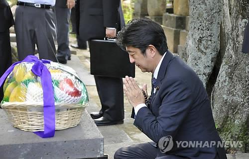 | △ '대동아공영권 이론가' 신사에 참배하는 아베 (야마구치현 교도=연합뉴스) 아베 신조(安倍晋三) 일본 총리가 13일 메이지 유신의 정신적 스승이자 제국주의 침략의 이론가였던 요시다 쇼인(吉田松陰·1830∼1859)을 기리는 '쇼인신사'에서 합장한 채 참배하고 있다. |
