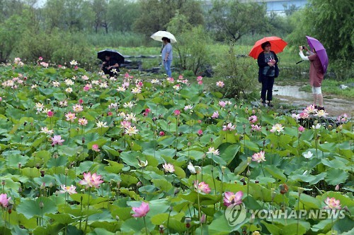 | △ 장맛비 내리는 연꽃단지 (부산=연합뉴스) 조정호 기자 = 남부지방에 장맛비가 내린 7일 부산시 사상구 삼락생태공원 내 연꽃단지에서 시민들이 우산을 쓰고 활짝 핀 연꽃을 구경하고 있다. |
