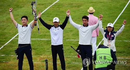 | △ <U대회> 김종호 첫 3관왕 (광주=연합뉴스) 7일 오전 광주 남구 광주국제양궁장에서 열린 2015 광주하계유니버시아드 양궁 컴파운드 남자 결승에서 한국의 김종호가(왼쪽)가 김태윤을 접전 끝에 물리친 뒤 손을 들어 환호하고 있다. 김종호는 이 승리로 첫 3관왕이 됐다. 2015.7.7 << 광주유니버시아드조직위 >> hkmpooh@yna.co.kr |