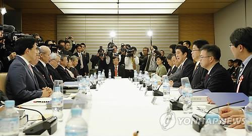 | △ 2015년 2월 25일 21세기 구상 간담회가 총리관저에서 아베 신조(安倍晋三) 일본 총리가 참석한 가운데 첫 회의를 하는 모습. (교도=연합뉴스 자료사진) |