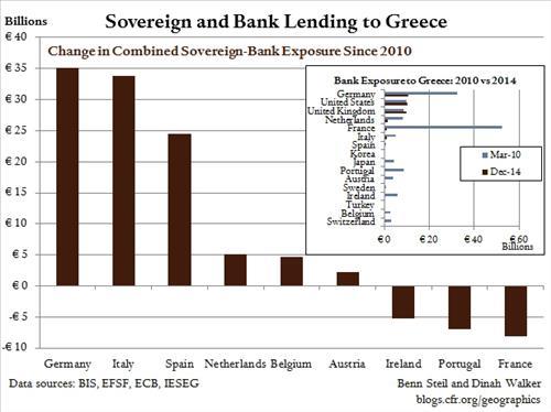 이는 독일 은행의 1.6배, 이탈리아 은행의 11배, 스페인 은행의 62배에 달하는 규모이며, 스페인의 경우 그리스 채권이 한자릿수에 불과해 거의 없는 상태나 마찬가지였다.
