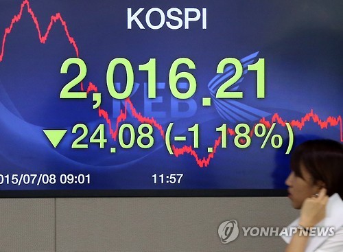 (서울=연합뉴스) 차대운 기자 = 코스피가 8일 외국인의 매도 공세를 견디지 못하고 2,010선으로 밀려났다.