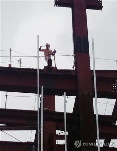 (서울=연합뉴스) 이효석 기자 = 8일 오후 1시30분께 서울 도봉구 지하철 1호선 도봉산역 신축역사 공사장에서 철거 책임자 황모(41)씨가 공사장 내 20여m 높이 철골 구조물에 올라가 3시간여 동안 시위를 벌였다.