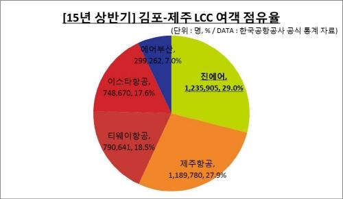 김포∼제주노선 여객기 1편당 탑승객 수는 진에어가 198.2명으로 가장 많고 대한항공 185.9명, 제주항공 174.4명, 티웨이항공 165.6명, 아시아나항공 163.5명, 에어부산 161.8명, 이스타항공 142.6명이다.