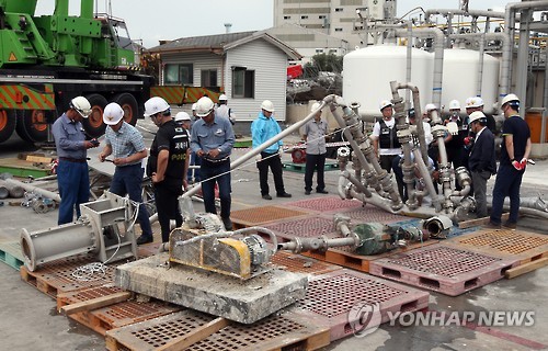 | △ 한화케미칼 폭발사고 2차 현장감식 (울산=연합뉴스) 김용태 기자 = 경찰과 국립과학수사연구원은 4일 한화케미칼 울산2공장에서 전날 발생한 폐수처리장 저장조 폭발사고에 대해 2차 현장감식을 실시했다. 이날 경찰과 국과수 관계자들이 폭발현장에서 수거한 잔해를 살펴보고 있다. 2015.7.4 yongtae@yna.co.kr |