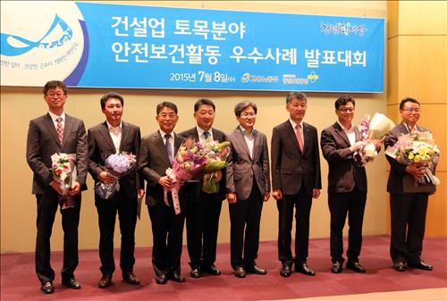 | △ SK건설은 고용노동부와 한국산업안전보건공단이 주최?주관하는 건설업 안전보건활동 평가에서 대상인 노동부장관상을 수상했다고 9일 밝혔다. 사진은 권순철(오른쪽 두번째) SK건설 팽성-오성 도로건설공사 현장소장이 시상식에서 기념촬영을 하고 있는 모습. SK건설 제공. |