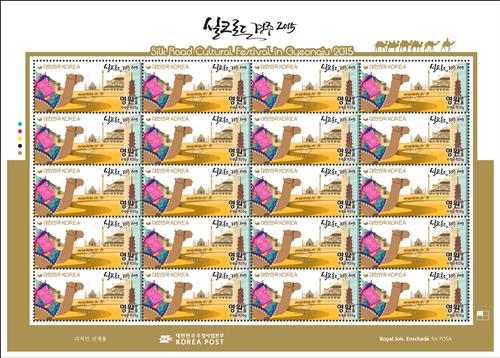 우표에는 실크로드의 주요 운송수단이었던 낙타가 비단·도자기 등의 교역품을 싣고 가는 모습과 통일신라의 사찰 불국사, 터키의 성 소피아 성당, 인도의 타지마할 등이 그림으로 담겼다.