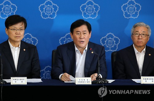 | △ 제8차 무역투자진흥회의 결과 합동브리핑 (서울=연합뉴스) 전수영 기자 = 최경환(가운데) 경제부총리 겸 기획재정부 장관이 9일 오후 정부서울청사에서 열린 합동브리핑에서 제8차 무역투자진흥회의 결과를 설명하고 있다. 최 부총리는 재건축·리모델링 중심으로 건축투자를 활성화해 450조원에 달하는 재건축 수요를 이끌어내겠다고 밝혔다. 왼쪽부터 최양희 미래창조과학부 장관, 최 부총리, 김종덕 문화체육관광부 장관. |