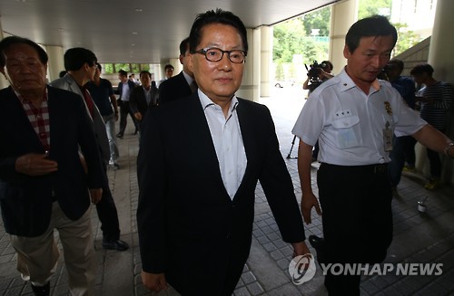 | △ 항소심 선고공판 출석하는 박지원 의원 (서울=연합뉴스) 김도훈 기자 = 저축은행들로부터 금품을 수수한 혐의 등으로 기소돼 1심에서 무죄를 선고받은 새정치민주연합 박지원 의원이 9일 오후 서울 서초구 서울고등법원에서 열린 항소심 선고공판 출석을 위해 건물로 들어서고 있다. |