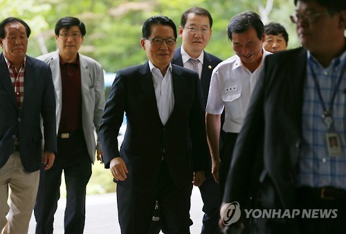 | △ 박지원 의원, 항소심 선고공판 출석 (서울=연합뉴스) 김도훈 기자 = 저축은행들로부터 금품을 수수한 혐의 등으로 기소돼 1심에서 무죄를 선고받은 새정치민주연합 박지원 의원이 9일 오후 서울 서초구 서울고등법원에서 열린 항소심 선고공판 출석을 위해 건물로 들어서고 있다. |