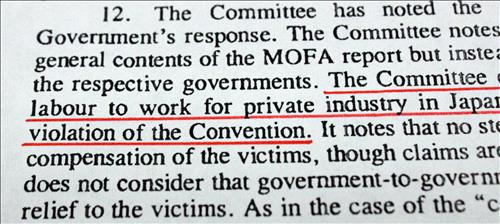 | △ ILO의 1999년 전문가위원회 보고서. 일제 강점기의 징용이 ILO 협약 위반이라고 명시하고 있다. |