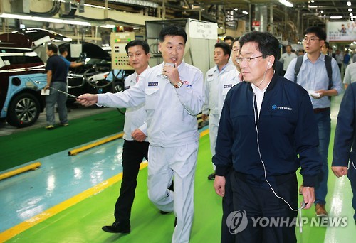 | △ 카니발 생산라인 둘러보는 윤상직 장관 (서울=연합뉴스) 윤상직 산업통상자원부 장관이 10일 수도권 지역의 대표적인 수출 산업기지인 광명시 기아자동차 소하리 공장을 방문, 카니발 생산라인 현장을 둘러보고 있다. 2015.7.10 << 산업통상자원부 제공 >> photo@yna.co.kr |