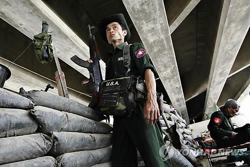 | △ 미얀마 남동쪽 카렌주, 태국과의 접경 지대에서 보초를 서고 있는 정부군.(EPA=연합뉴스 자료사진) |