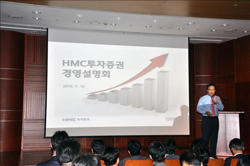 | △ HMC투자증권 김흥제 사장이 10일 여의도 한국금융투자협회 불스홀에서 임직원들을 상대로 상반기 경영성과에 대해 설명하고 있다. |