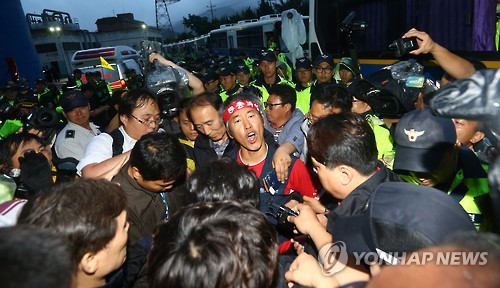 | △ 연행되는 차광호씨 (칠곡=연합뉴스) 김준범 기자 = 8일 오후 경북 칠곡군 스타케미칼내 굴뚝 위에서 내려온 해고 근로자 차광호(46)씨가 경찰에 연행되며 몸싸움을 하고 있다. 차씨는 45m 높이의 공장 굴뚝에서 해고자 복직을 요구하며 408일 동안 농성을 벌였다. 2015.7.8 psykims@yna.co.kr |