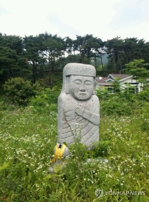 | △ "서산 산수리 진짜 미륵은 속히 돌아오시오"…서산주민들 회수운동 (서산=연합뉴스) 강진욱 기자 = 충청남도 서산 해미읍성의 동서남북 사방비보(四方裨補) 가운데 하나로, 주민들 몰래 팔려나간 산수리 돌미륵(돌장승)이 경기도 용인시 에버랜드 내 호암미술관 정원에 서 있다는 주장이 제기되면서 주민들이 이 돌장승을 돌려받기 위해 너나없이 나서고 있다. 현재 산수리 길목 옆 들판에 세워져 있는 미륵(사진)은 밀매된 산수리 미륵과 흡사한 황락리 미륵불을 본 떠 새로 만든 것으로, 주민들은 산수리 미륵불이 없어진 1980년이나 그 이듬해 또는 1984년 세워졌다고 증언하고 있다. 2015.7.9. kjw@yna.co.kr |