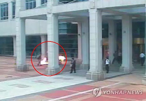 | △ 울산시청에 불 지르는 60대 남성 (울산=연합뉴스) 10일 오전 울산시청 정문에서 정모(61)씨가 승합차로 건물을 들이받고 불을 지르다 경찰에게 붙잡혔다. 사진은 정씨가 바닥에 뿌린 휘발유에 불을 붙이는 모습이 찍힌 폐쇄회로(CC)TV 장면. 2015.7.10 << 울산시청 CCTV 화면 캡처 >> yongtae@yna.co.kr |