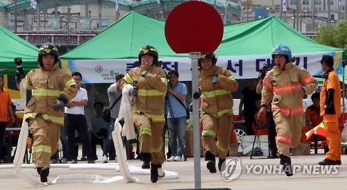 화재진압 경연에서는 불볕더위 속에서도 두꺼운 방화복을 입은 소방관들이 심판의 출발 신호가 떨어지자마자 묵직한 소방호스를 들고 뛰고 전력 질주하는 것이 실제 화재 현장에 출동한 것과 다를 바 없었다.